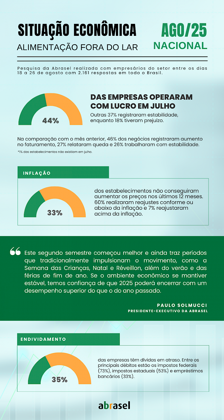 O setor de alimentação fora do lar começou o segundo semestre com boas notícias. De acordo com pesquisa da Abrasel, 44% dos estabelecimentos registraram lucro em julho, enquanto 37% operaram em equilíbrio. Já o número de empresas no vermelho caiu para 18%, quatro pontos percentuais abaixo do observado em junho.